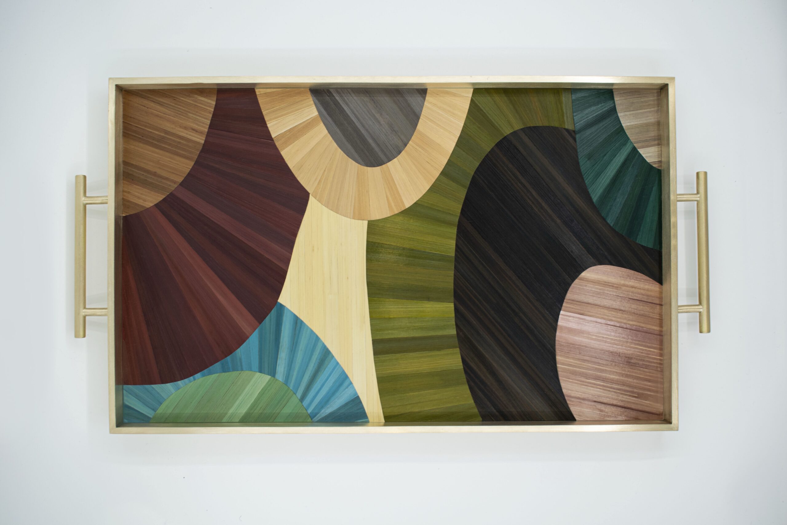 The size of the tray, the colors of the straw marquetry and the finish of the brass frame can be customized.